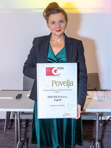 Hrvatsko društvo za kvalitetu dodijelilo je društvu HEP-ESCO Povelju za poseban doprinos u edukaciji i promociji kvalitete na svečanoj dodjeli održanoj 17. prosinca u Zagrebu.