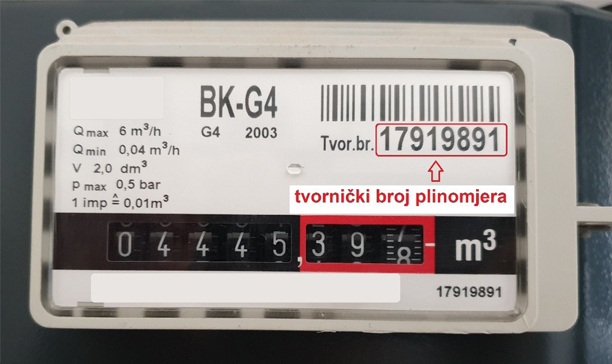 Broj plinomjera je tvornički dodijeljena identifikacijska brojčana oznaka plinomjera. Broj plinomjera naznačen je na svakom plinomjeru neovisno o vrsti i tipu plinomjera i trebao bi se podudarati s podatkom o broju plinomjera navedenom na računu za isporučeni plin.