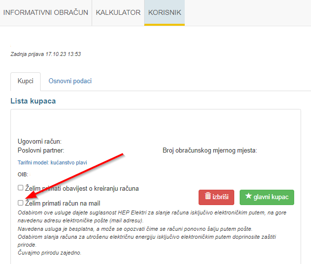 posredstvom aplikacije Moj račun svaki kupac HEP Elektre može jednostavno aktivirati jednim klikom. Odnosno nakon prijave u aplikaciju Moj račun na alatnoj traci potrebno je odabrati polje Korisnik te razgranati podatke ispod naziva Lista kupaca (slika 1.) i označiti polje „Želim primati račun na mail“ (slika 2.).