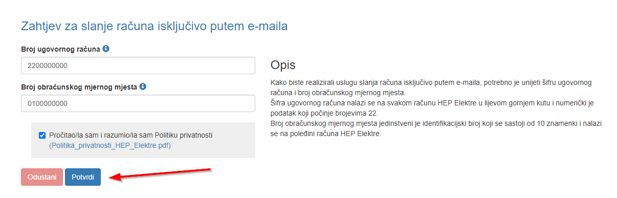 Klikom na navedeno polje daje se suglasnost za prihvat računa isključivo elektroničkim putem (e-mailom). Usluga se može opozvati micanjem kvačice iz polja „pristajem“ čime se računi ponovno upućuju putem pošte.