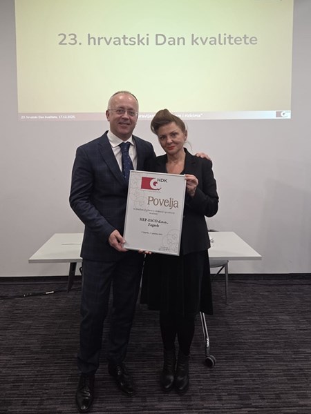 Hrvatsko društvo za kvalitetu dodijelilo je društvu HEP-ESCO Povelju za poseban doprinos u edukaciji i promociji kvalitete na svečanoj dodjeli održanoj 17. prosinca u Zagrebu.