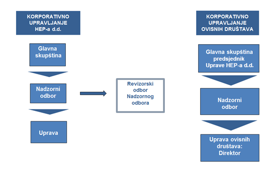 U skladu s korporacijskim modelom upravljanja HEP grupom, HEP d.d. upravlja poslovima i obavlja dio poslova iz područja korporativnih funkcija te usmjerava, koordinira i prati djelatnosti u ovisnim društvima.