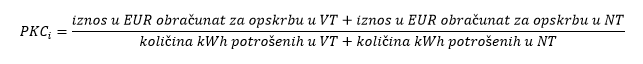 – PKCi = prosječna jedinična cijena električne energije koju kupac plaća opskrbljivaču za prodanu električnu energiju, isključujući dio cijene koji se regulira za potrebe prijenosa i distribucije električne energije te sve naknade i davanja propisana posebnim propisima, unutar obračunskog razdoblja, izražena u EUR/kWh: